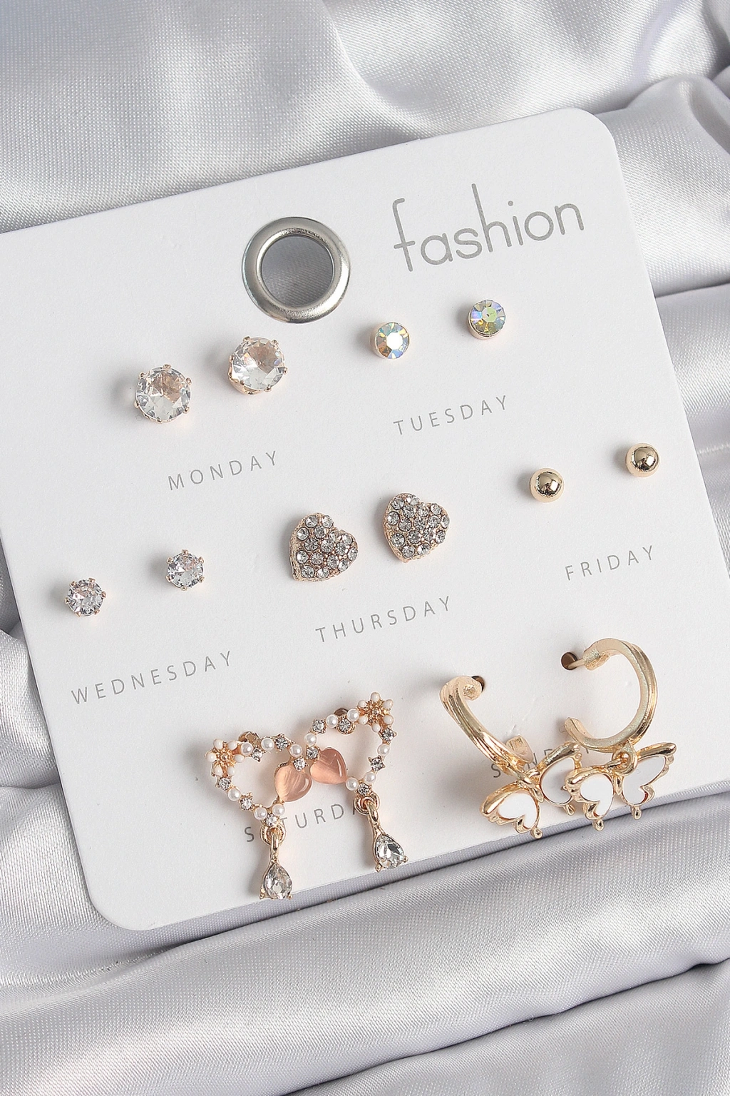 Erb Pirinç Gold Renk Zirkon Taşlı Sallantılı Kalp Figür Kelebek Detay 7 Çift Kadın Küpe Seti