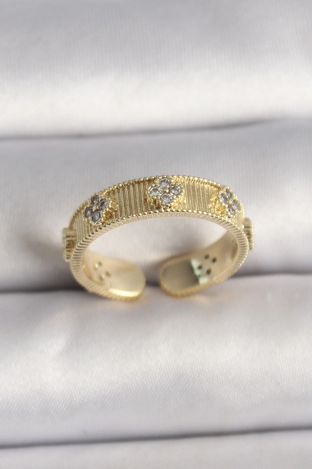 Erb Pirinç Gold Renk Zirkon Taşlı Yonca İşlemeli Ayarlanabilir Yüzük