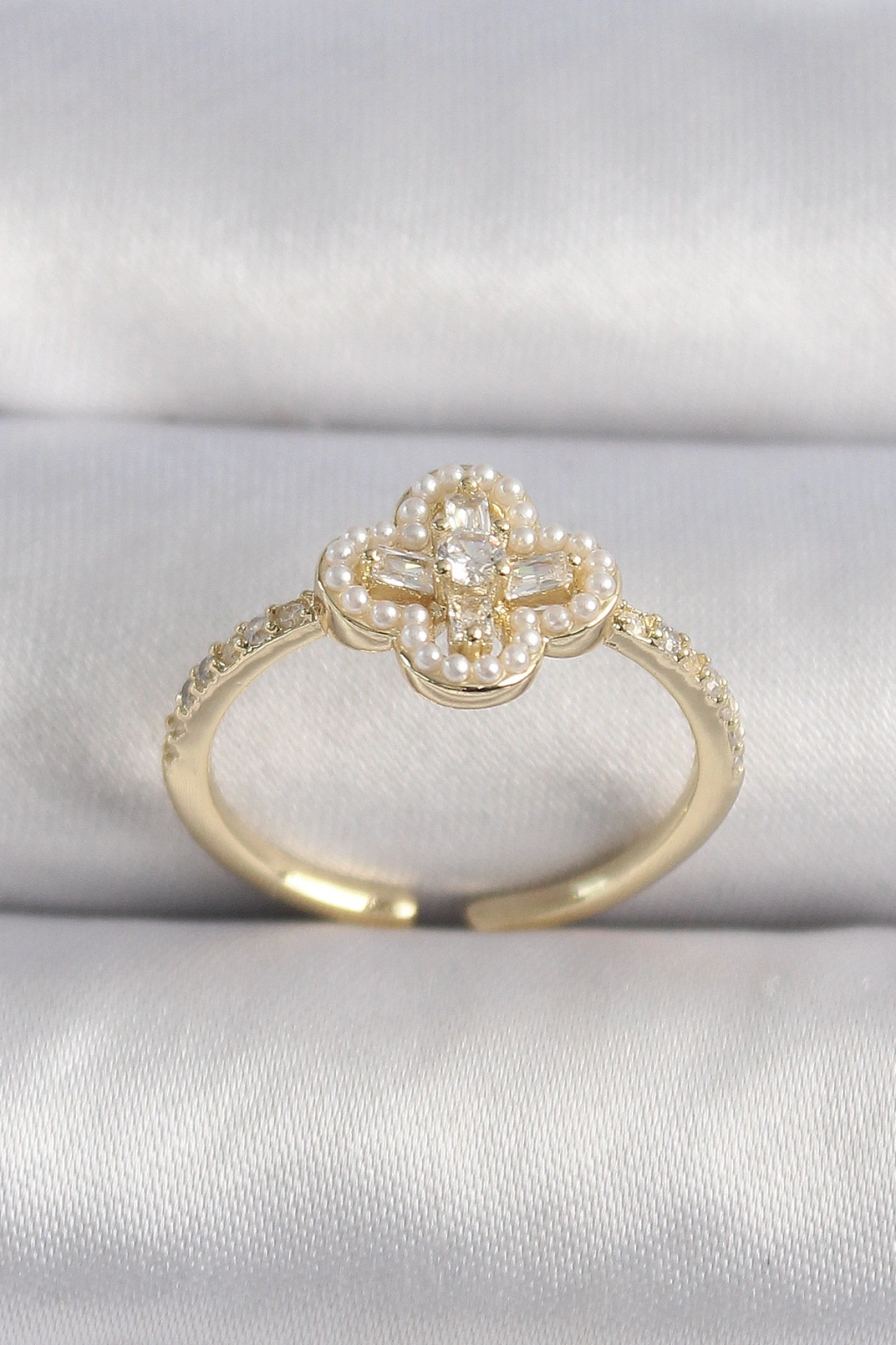 Erb Pirinç Gold Renk Zirkon Taşlı Yonca Model İnci Detay Kadın Yüzük