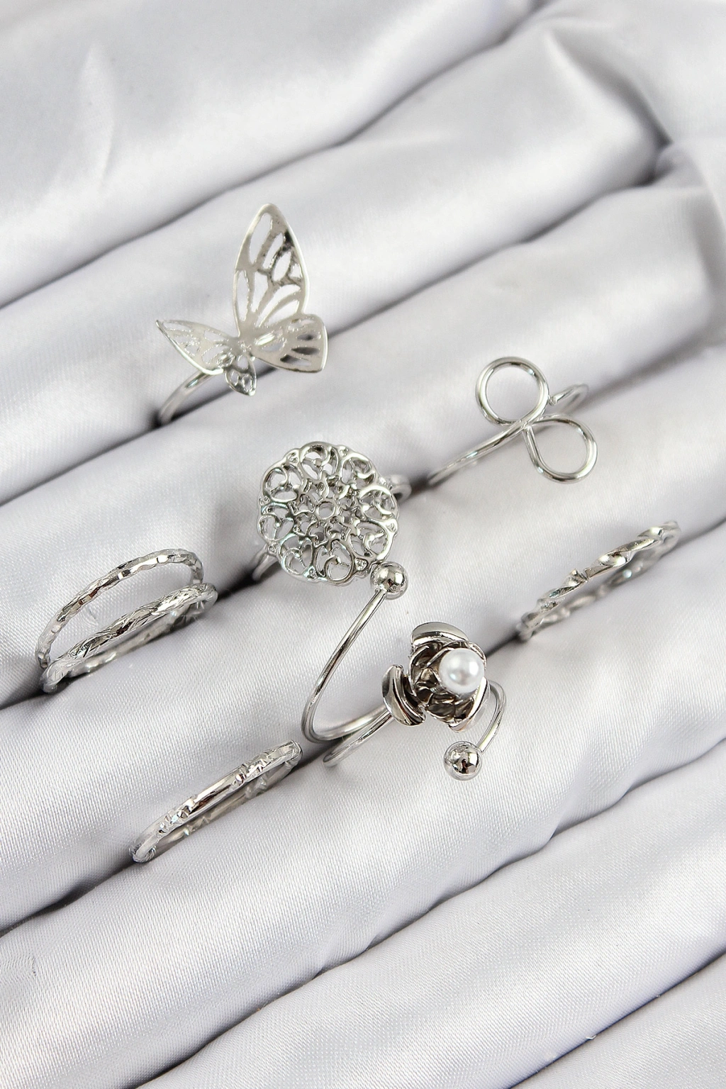 Erb Pirinç Gül Kelebek Model Gümüş Renk Kadın Yüzük Kombin Set