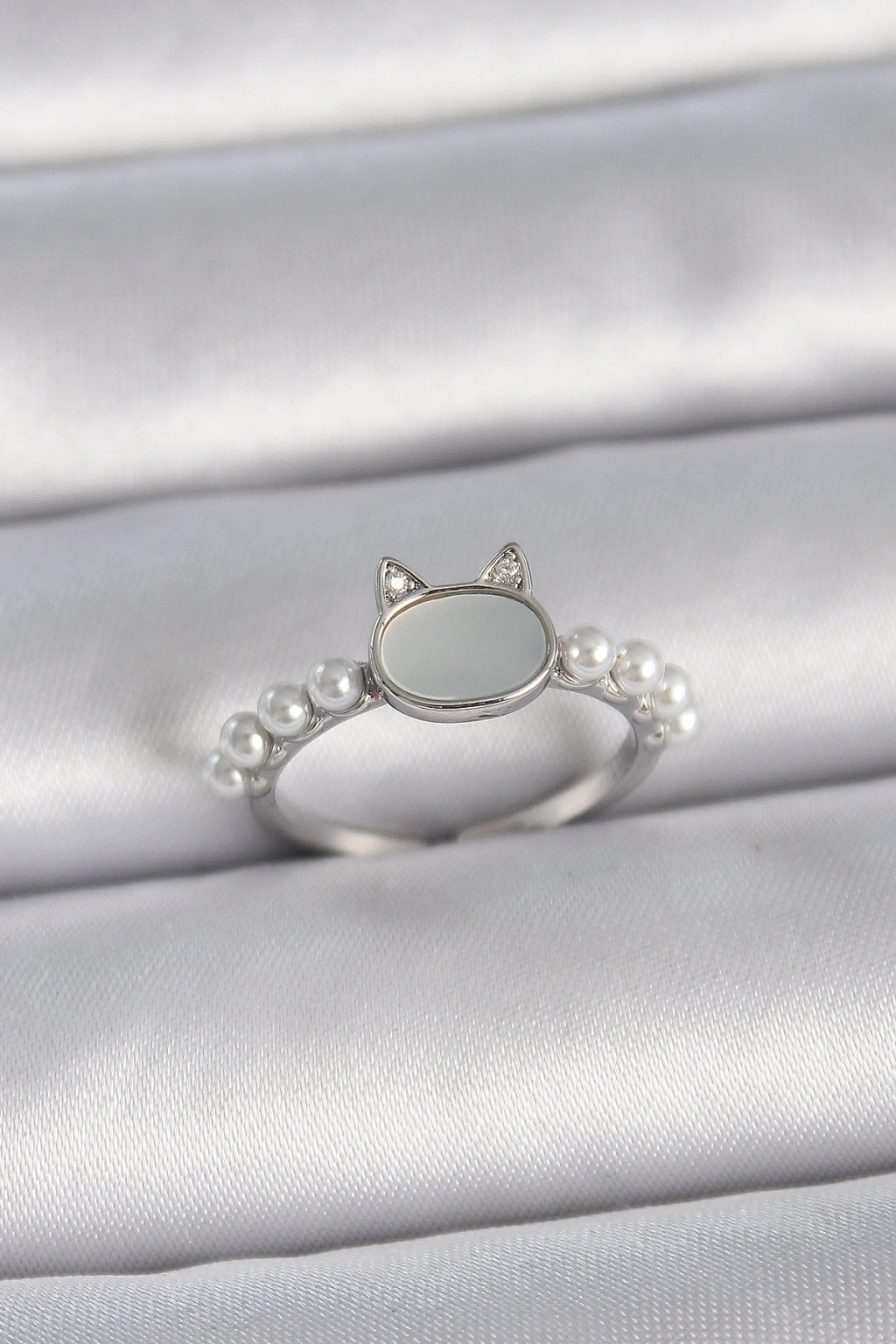 Erb Pirinç Gümüş Renk Ayarlanabilir Beyaz Mineli Kedi Model İnci Detay Kadın Yüzük