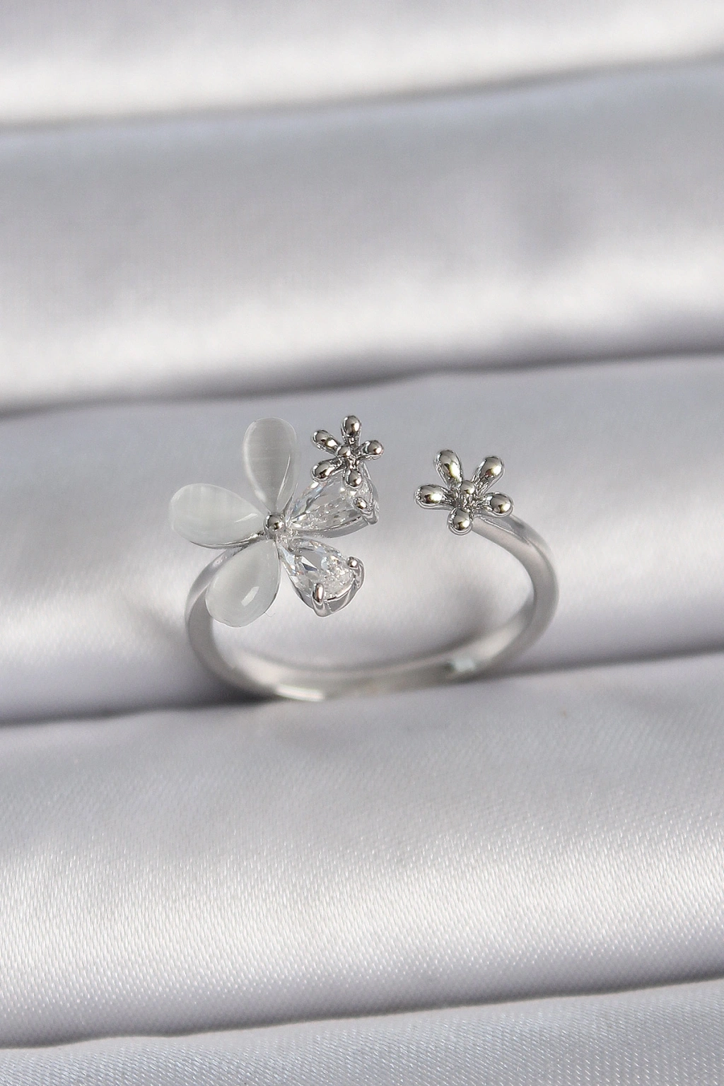 Erb Pirinç Gümüş Renk Ayarlanabilir Zirkon Taşlı Beyaz Mineli Yaprak Model Kadın Yüzük