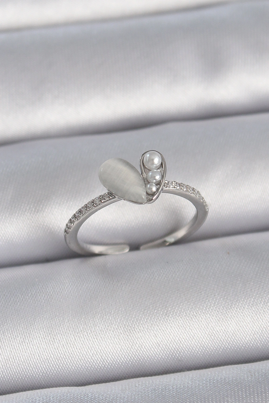 Erb Pirinç Gümüş Renk Ayarlanabilir Zirkon Taşlı İncili Beyaz Mineli Kalp Model Kadın Yüzük