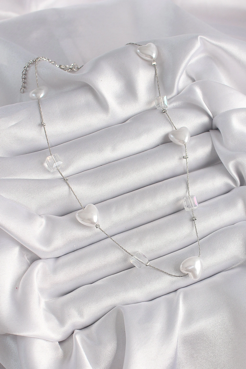 Erb Pirinç Gümüş Renk Beyaz İnci Kalp Model Kadın Kolye
