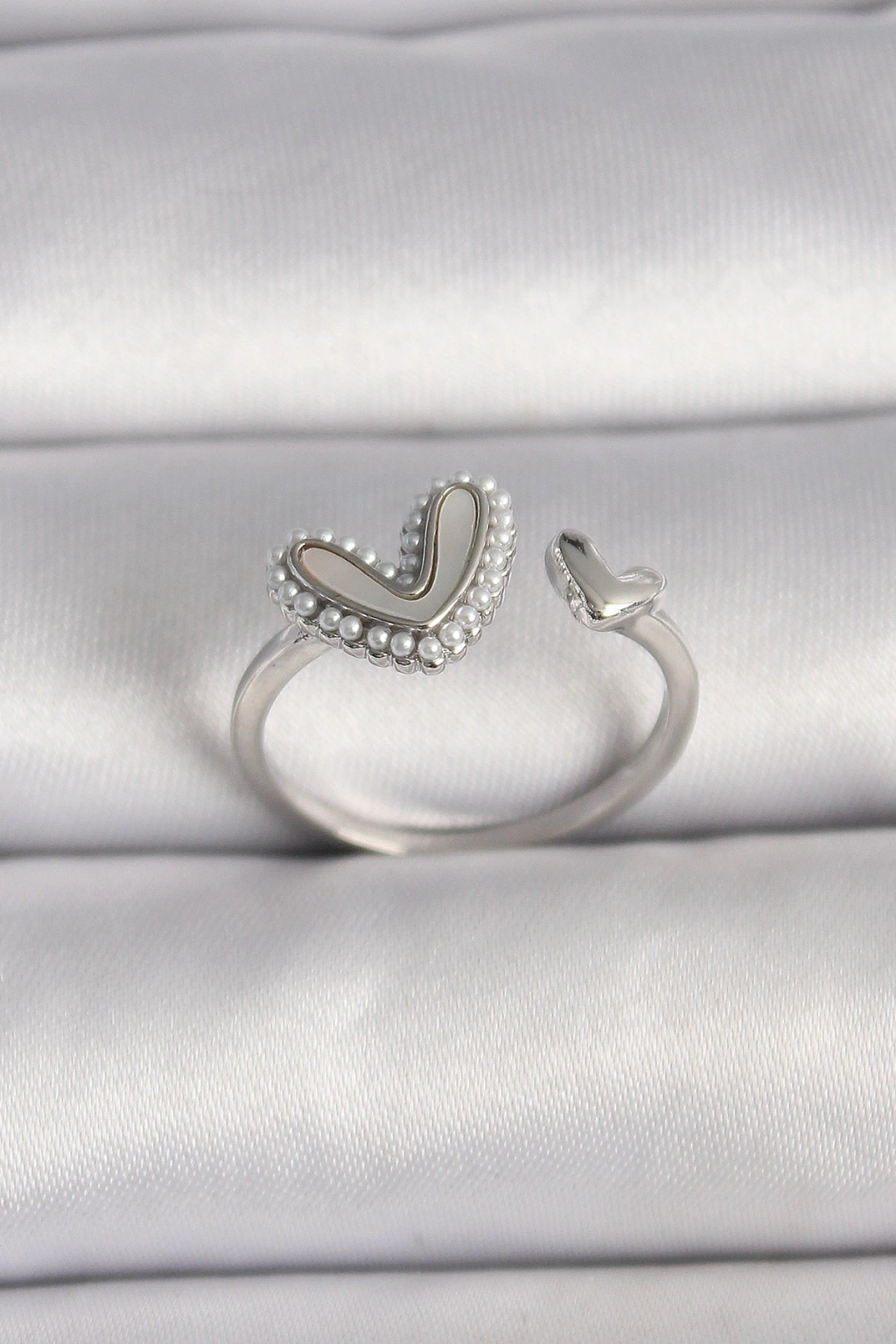 Erb Pirinç Gümüş Renk Beyaz Mineli İnci Detaylı Kalp Model Ayarlanabilir Yüzük