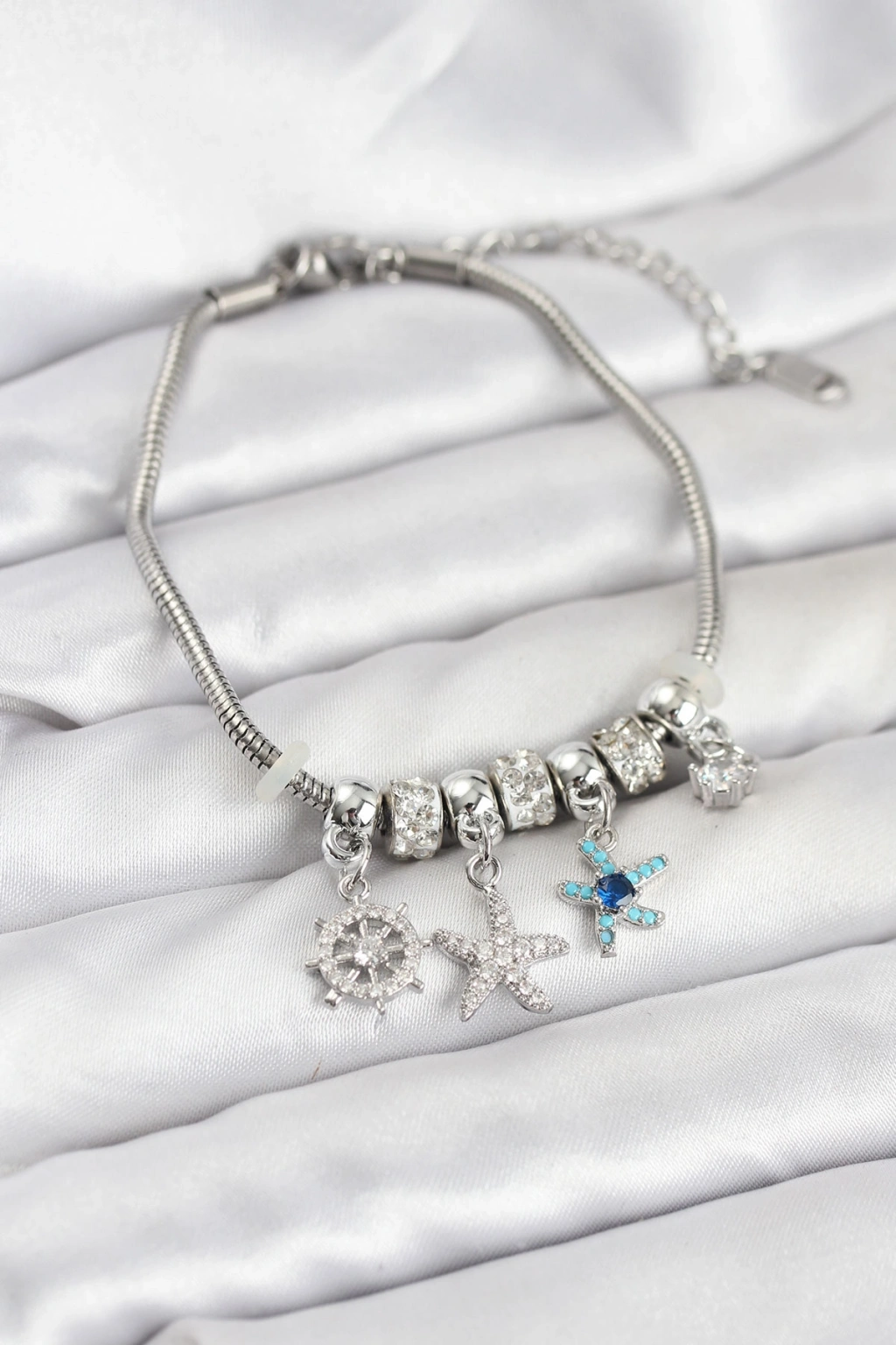 Erb Pirinç Gümüş Renk Deniz Tema Charmlı Kadın Bileklik