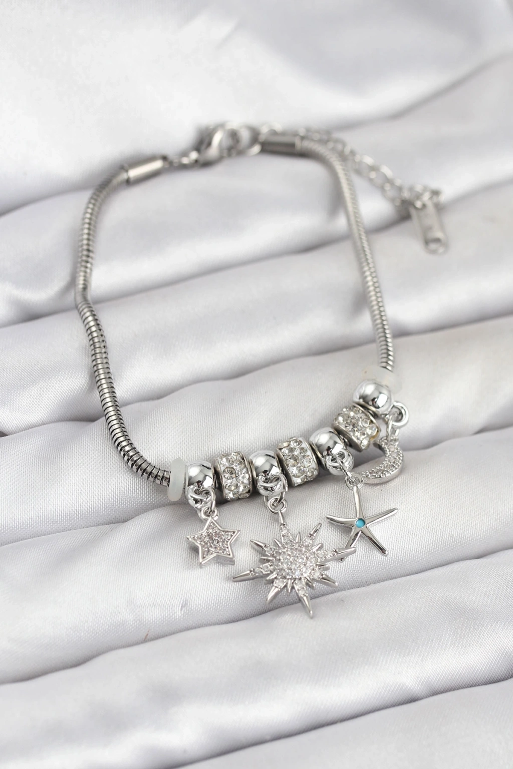 Erb Pirinç Gümüş Renk Güneş Tema Charmlı Kadın Bileklik
