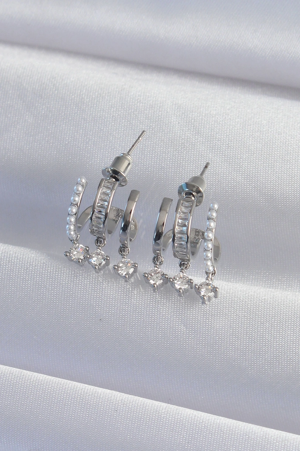 Erb Pirinç Gümüş Renk İncili Çoklu Zirkon Taşlı Yarım Halka Küpe
