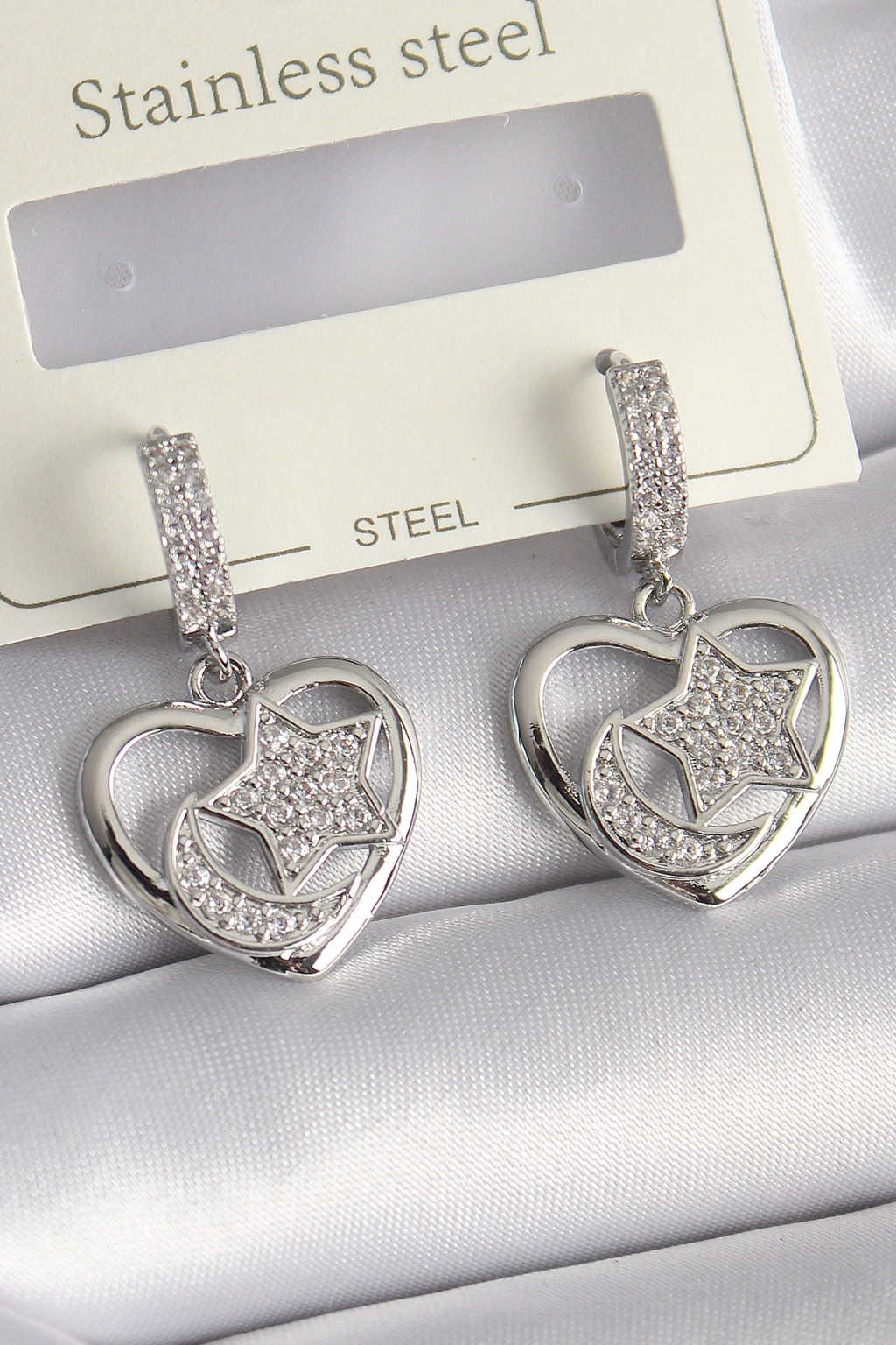 Erb Pirinç Gümüş Renk Kalp Model Zirkon Taşlı Ay Yıldız İşlemeli Kadın Küpe