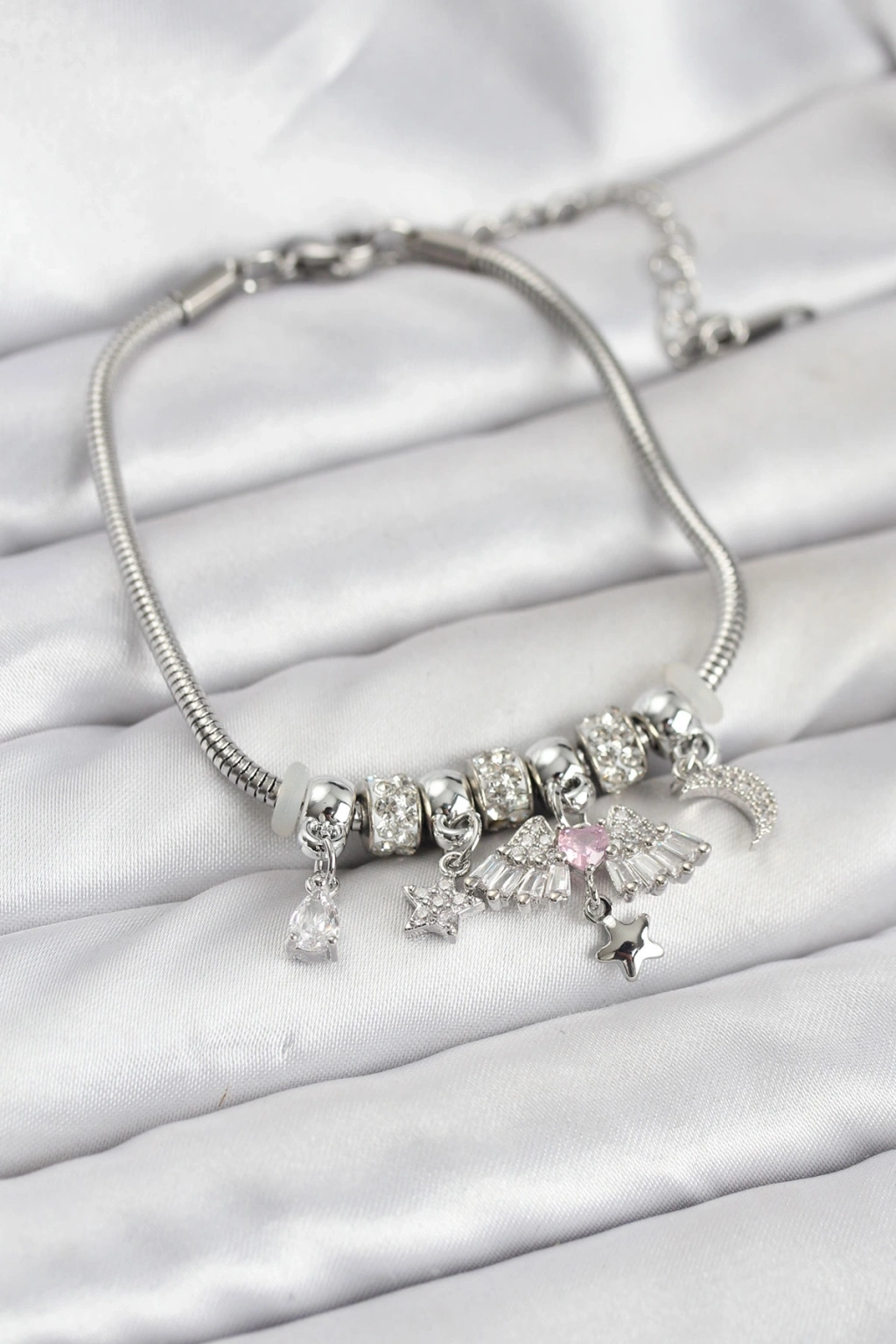 Erb Pirinç Gümüş Renk Kanatlı Charmlı Kadın Bileklik
