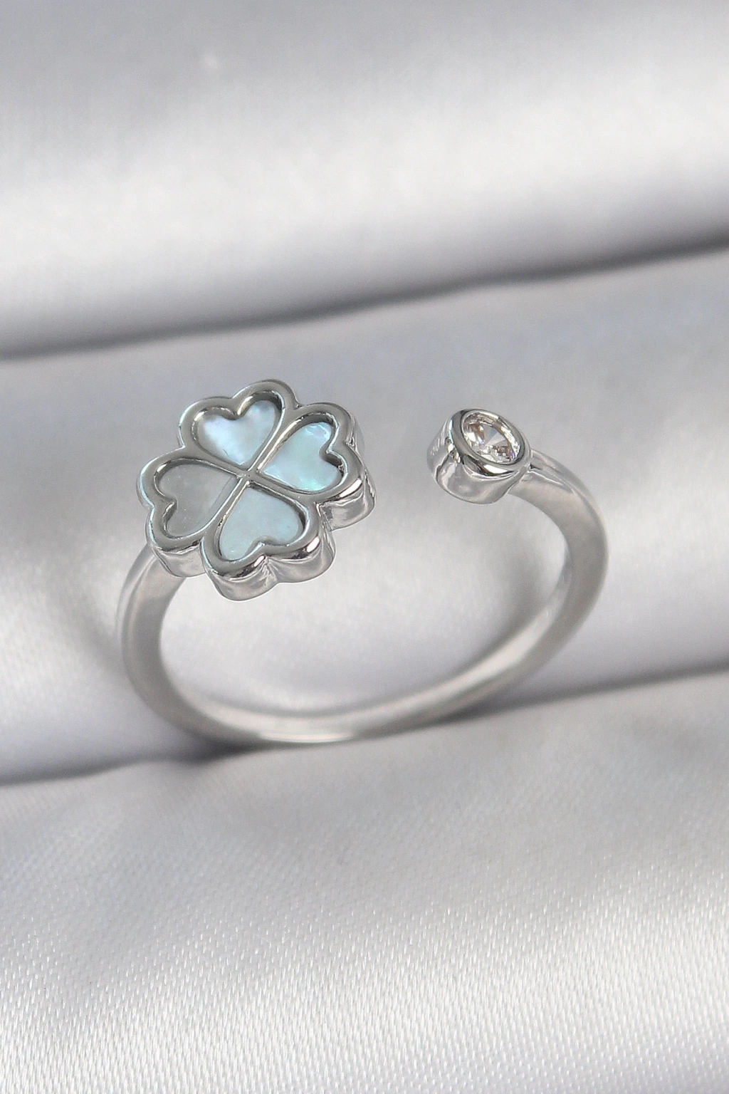 Erb Pirinç Gümüş Renk Mavi Mineli Yonca Model Zirkon Taş Detay Ayarlanabilir Kadın Yüzük