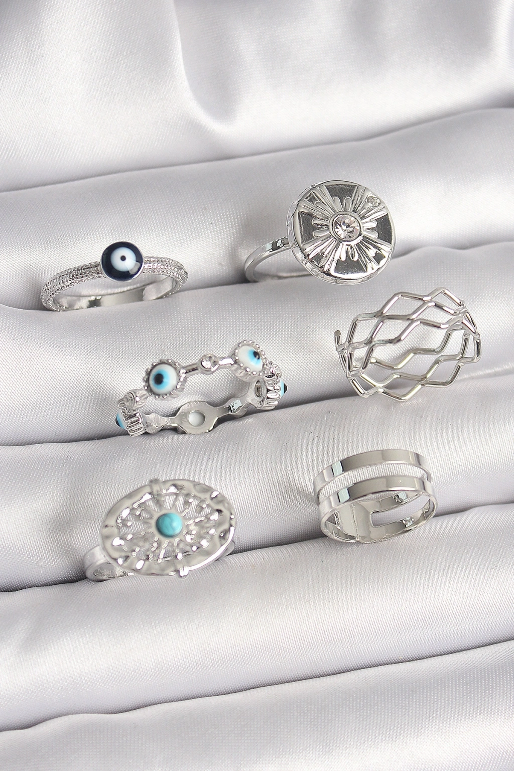 Erb Pirinç Gümüş Renk Nazar Boncuk Zirkon Taş Detaylı Dalga Figür Kadın Yüzük Kombini