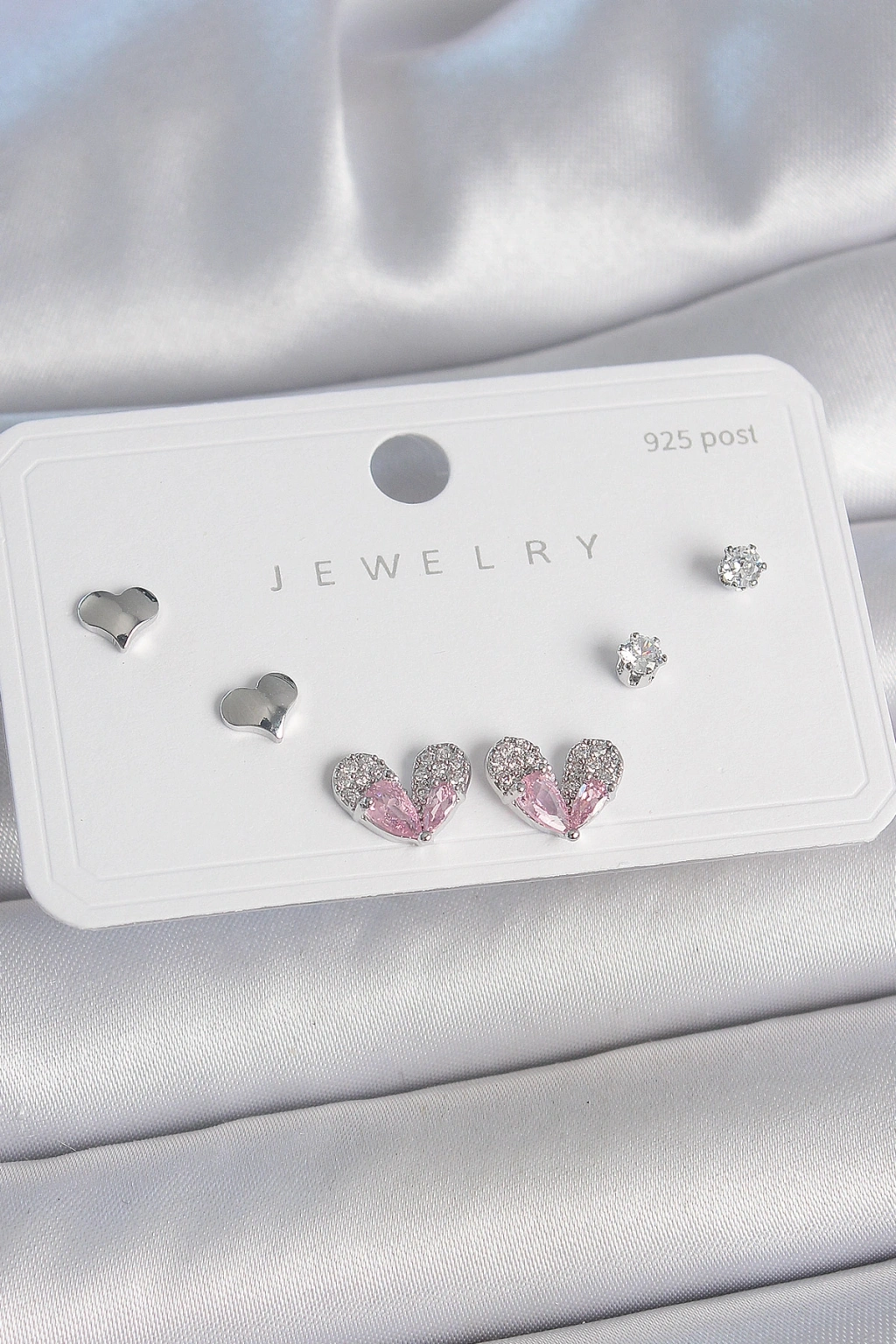 Erb Pirinç Gümüş Renk Pembe Zirkon Taşlı Kalp Model 925 Ayar Gümüş Çivi Kadın Küpe Seti