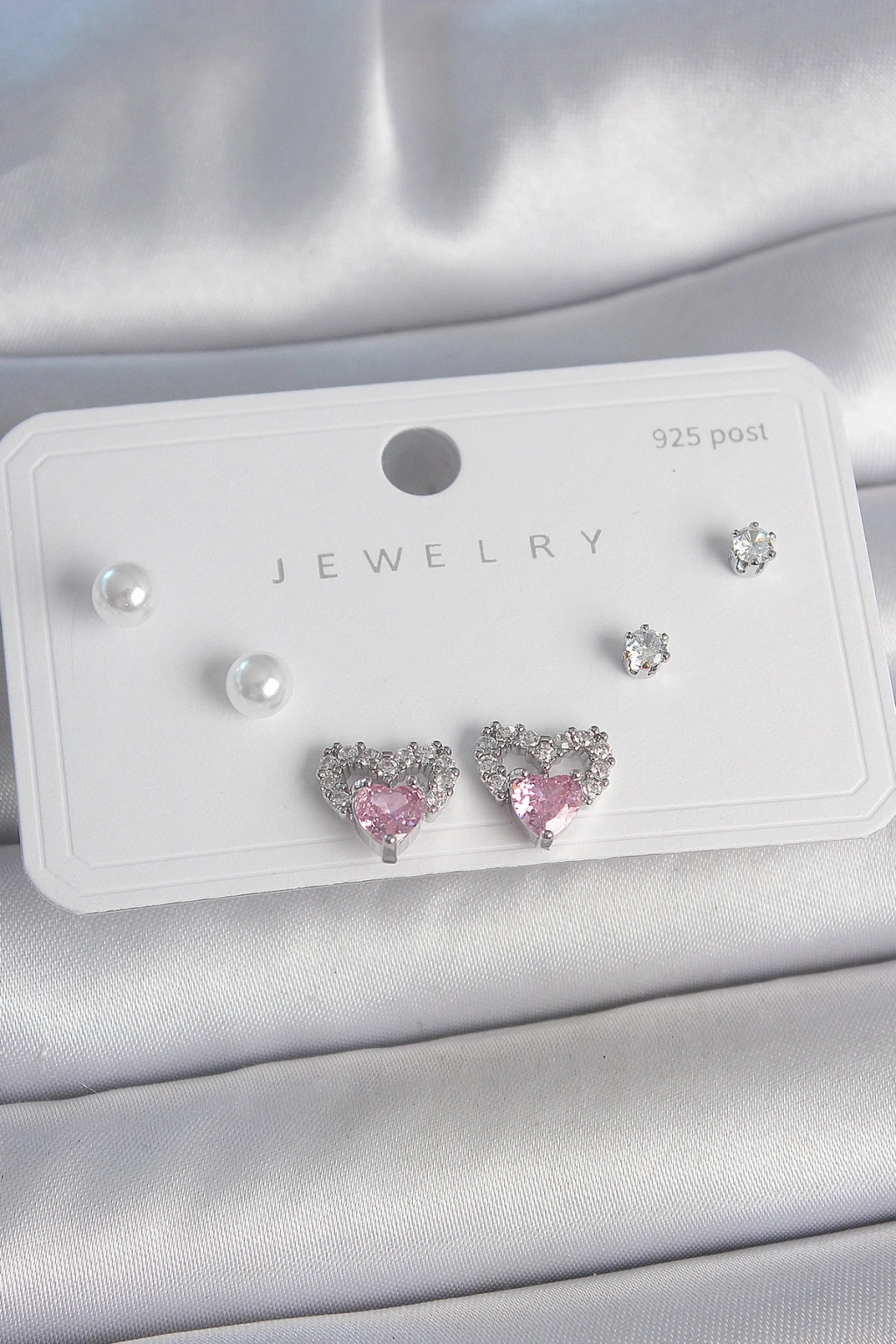 Erb Pirinç Gümüş Renk Pembe Zirkon Taşlı Kalp Model İnci Detay 925 Ayar Gümüş Çivi Kadın Küpe Seti