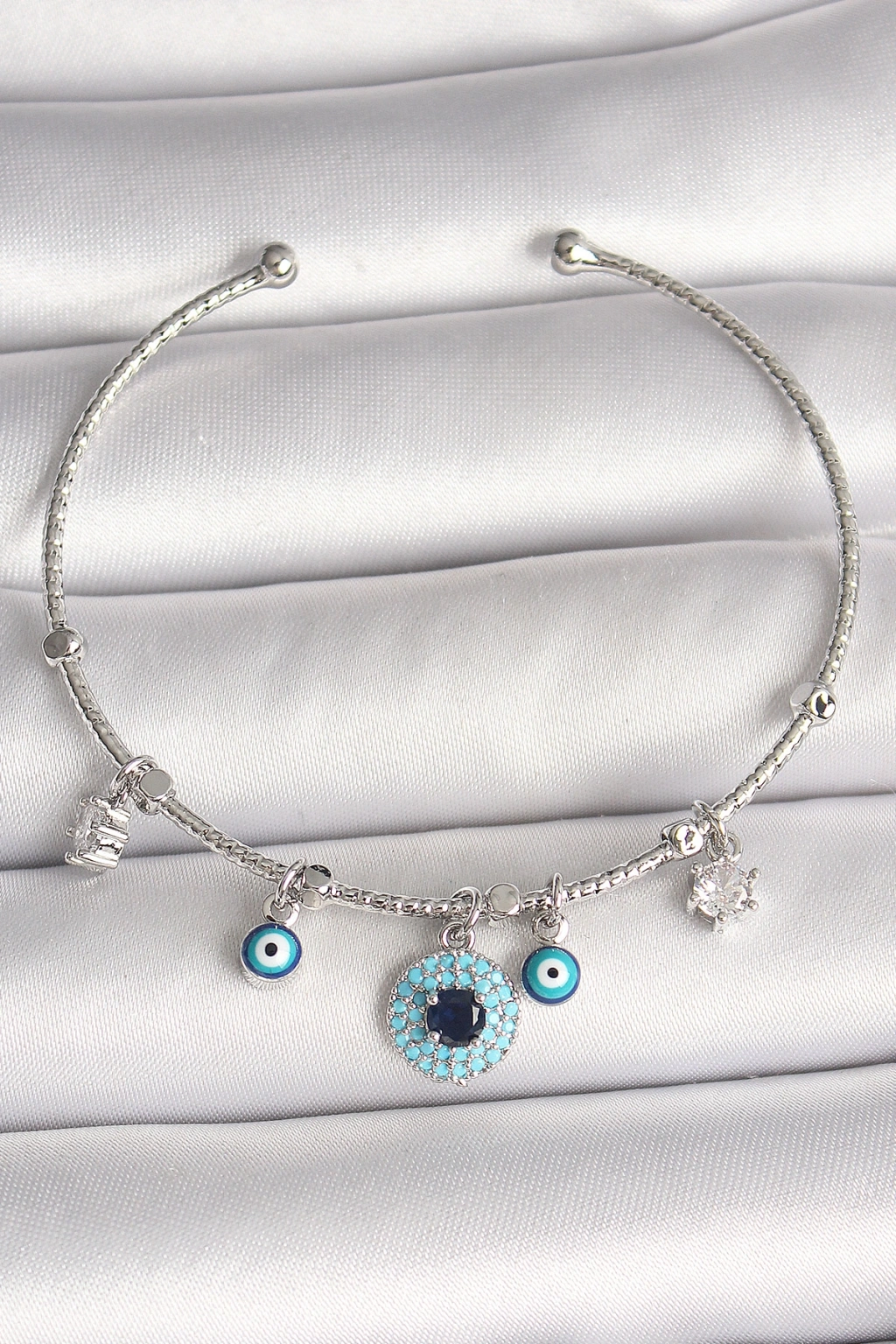 Erb Pirinç Gümüş Renk Sallantı Zirkon Taşlı Nazar Boncuk Figür Charm Kadın Bileklik