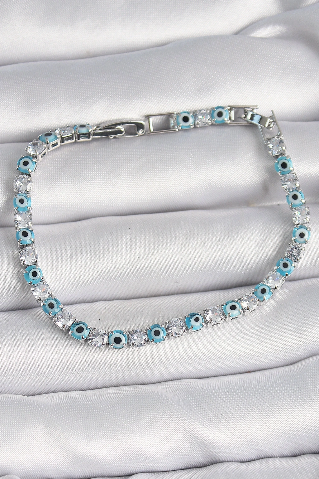 Erb Pirinç Gümüş Renk Su Yolu Zirkon Taşlı Nazar Boncuklu Kadın Bileklik