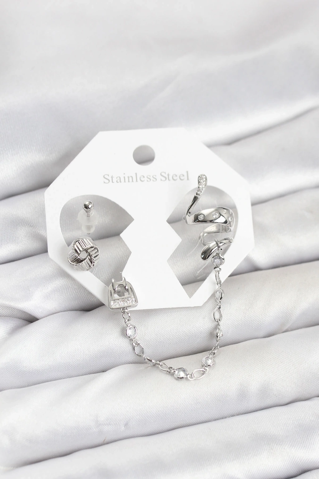 Erb Pirinç Gümüş Renk Yılan Model Zincir Bağlantılı Ear Cuff Küpe Seti