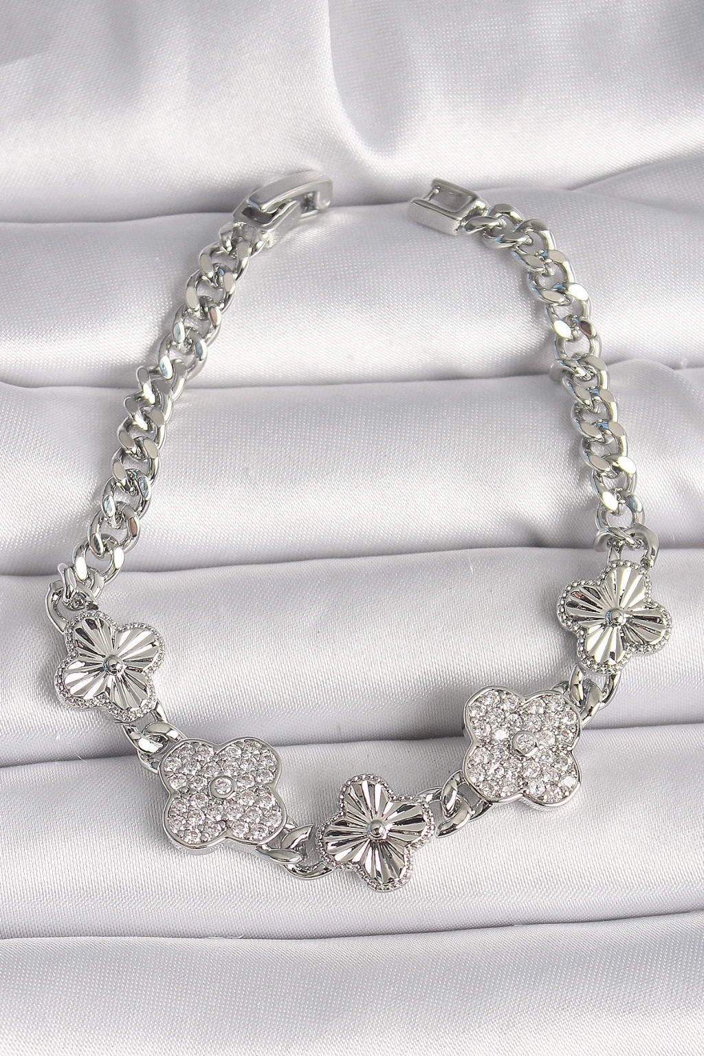 Erb Pirinç Gümüş Renk Zincir Yonca Model Kadın Bileklik