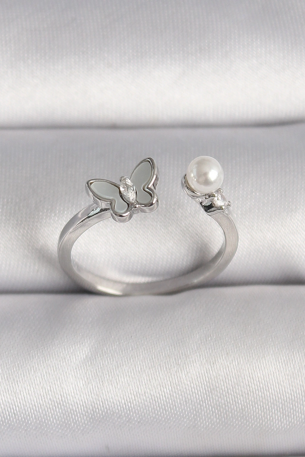 Erb Pirinç Gümüş Renk Zirkon Taş Detaylı Beyaz Mineli Kelebek Figür İnci Detay Ayarlanabilir Yüzük