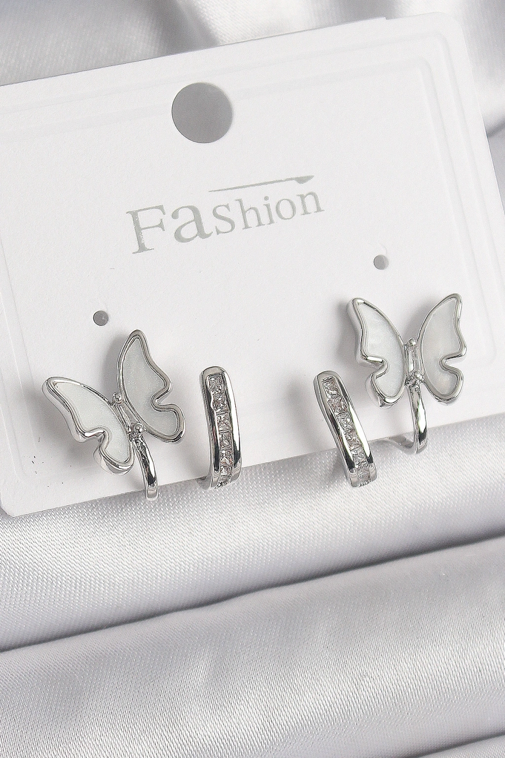Erb Pirinç Gümüş Renk Zirkon Taş Detaylı Beyaz Sedefli Kelebek Model Kadın Küpe