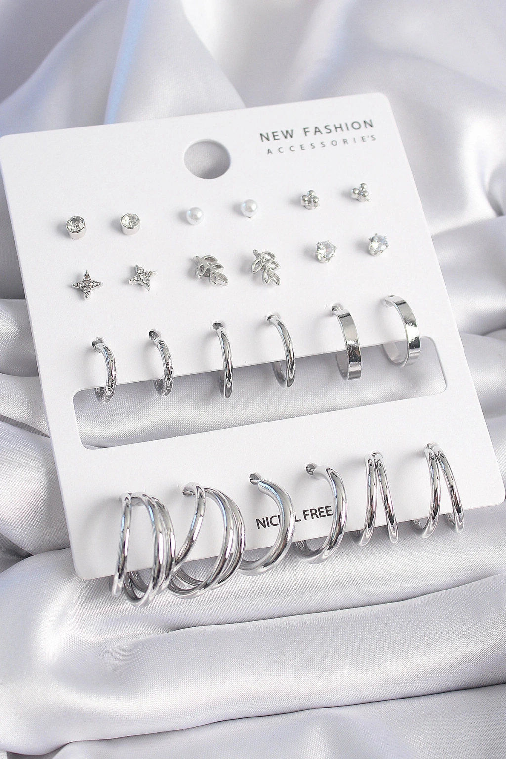 Erb Pirinç Gümüş Renk Zirkon Taşlı 12 Çift Küpe Seti