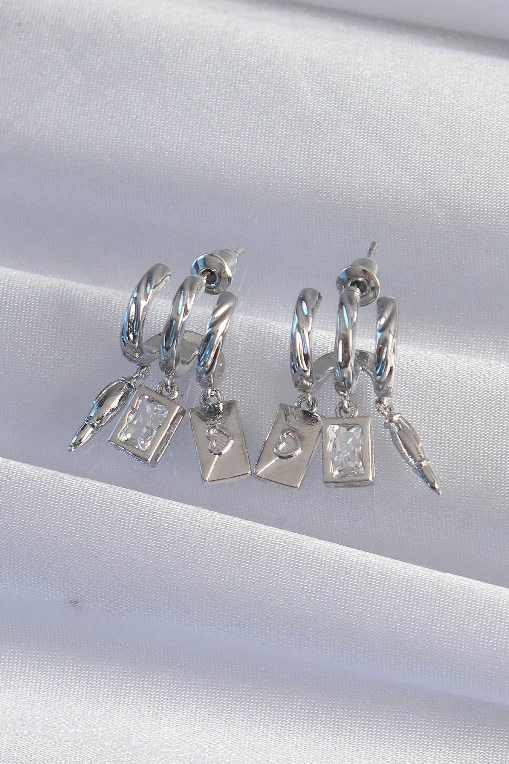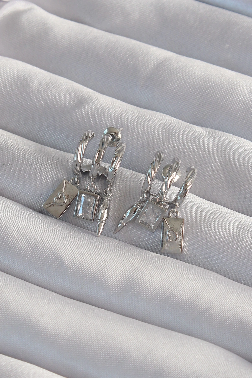 Erb Pirinç Gümüş Renk Zirkon Taşlı Çoklu Aksesuarlı Yarım Halka Kaburga Küpe