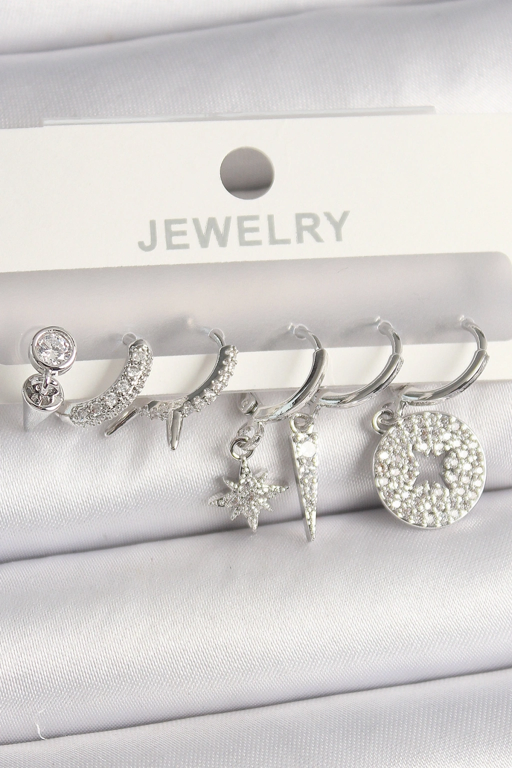 Erb Pirinç Gümüş Renk Zirkon Taşlı Çoklu Figür Kadın Küpe Seti
