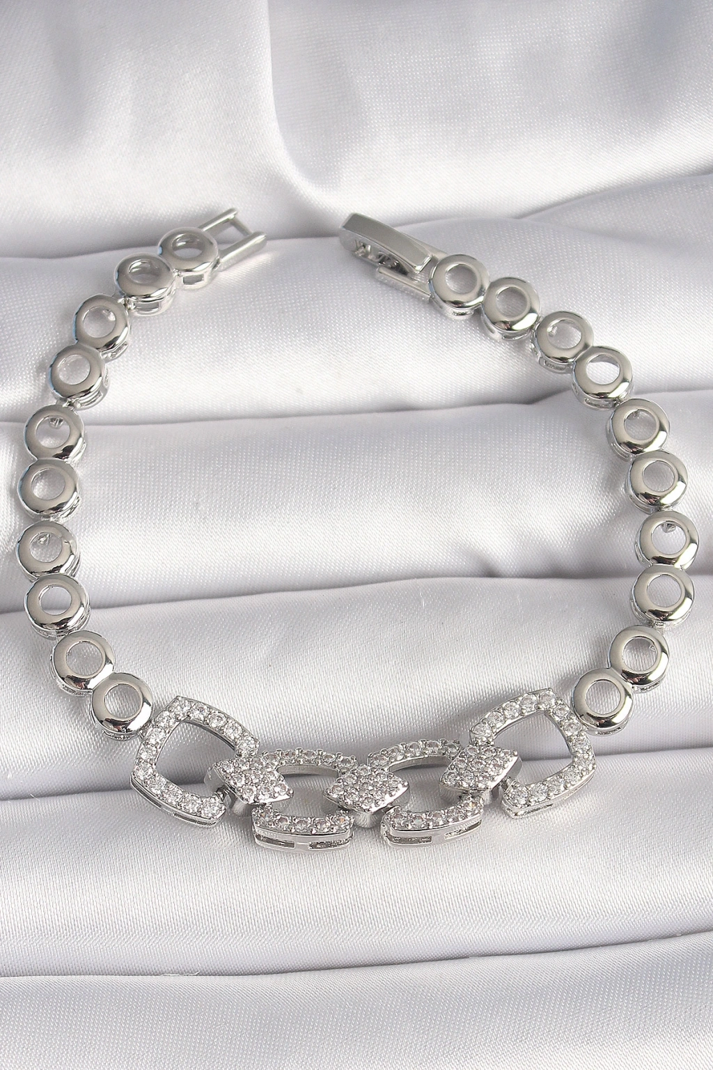 Erb Pirinç Gümüş Renk Zirkon Taşlı Daire Zincir Model Kadın Bileklik