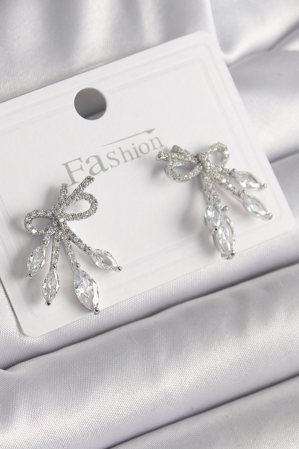 Erb Pirinç Gümüş Renk Zirkon Taşlı Düğüm Model Damla Zirkon Taşlı Kadın Küpe