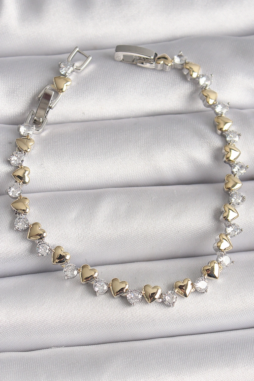 Erb Pirinç Gümüş Renk Zirkon Taşlı Gold Kalpli VIP Seri Kadın Bileklik