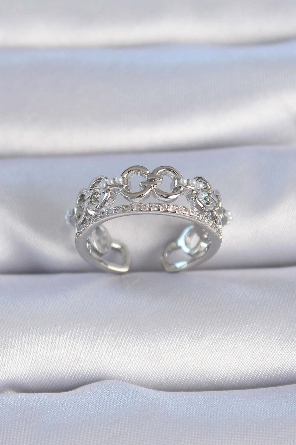 Erb Pirinç Gümüş Renk Zirkon Taşlı İnci Detay Kadın Yüzük