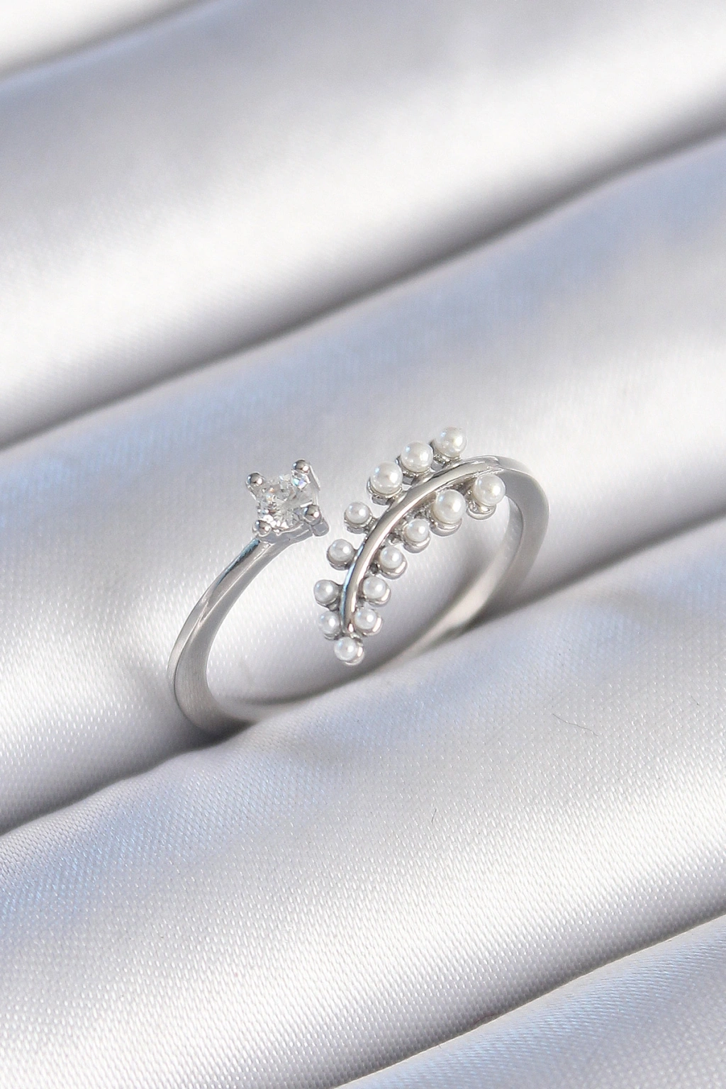 Erb Pirinç Gümüş Renk Zirkon Taşlı İncili Yaprak Model Kadın Yüzük
