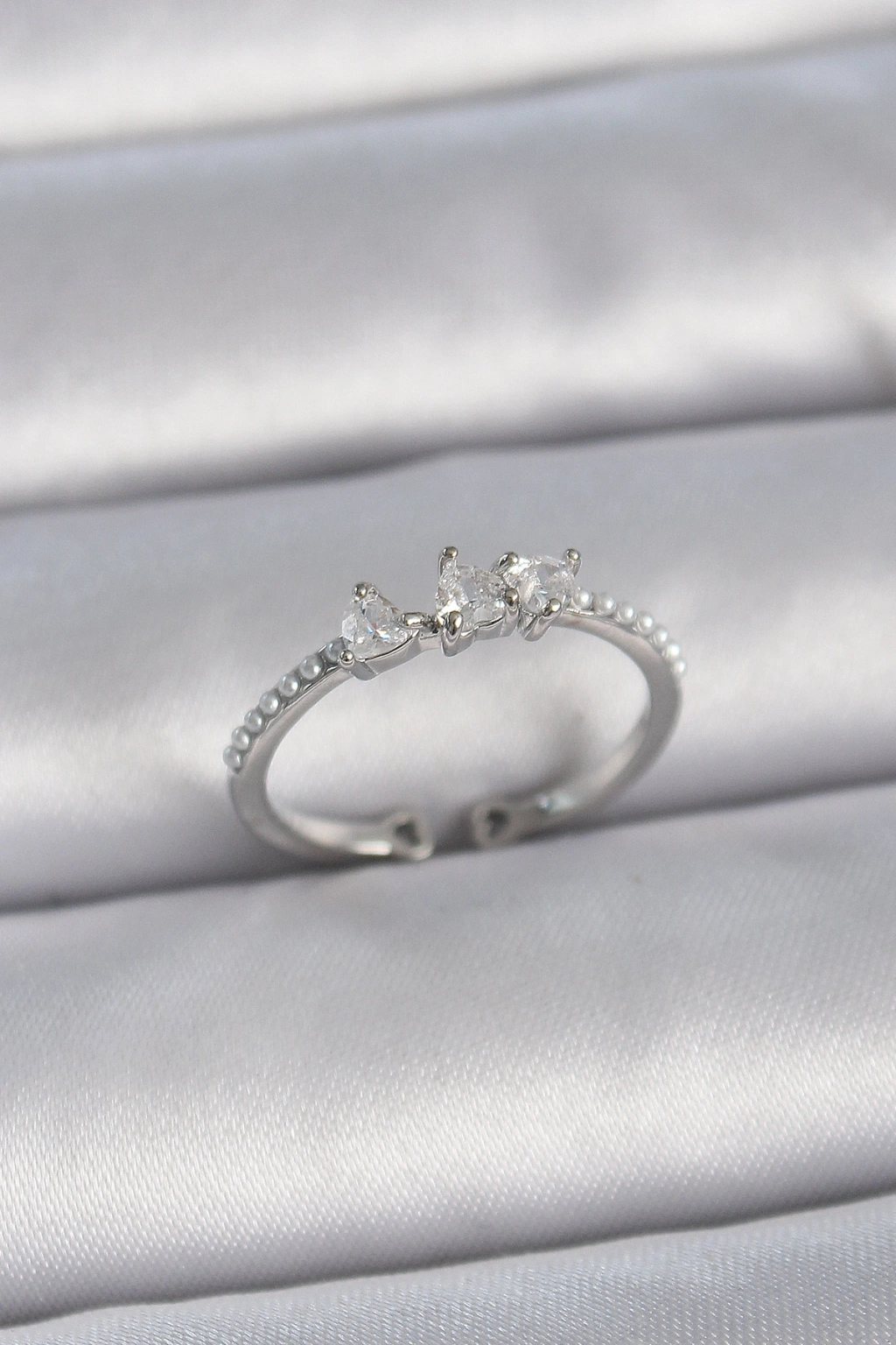 Erb Pirinç Gümüş Renk Zirkon Taşlı Kalp İnci Detay Ayarlanabilir Model Kadın Yüzük