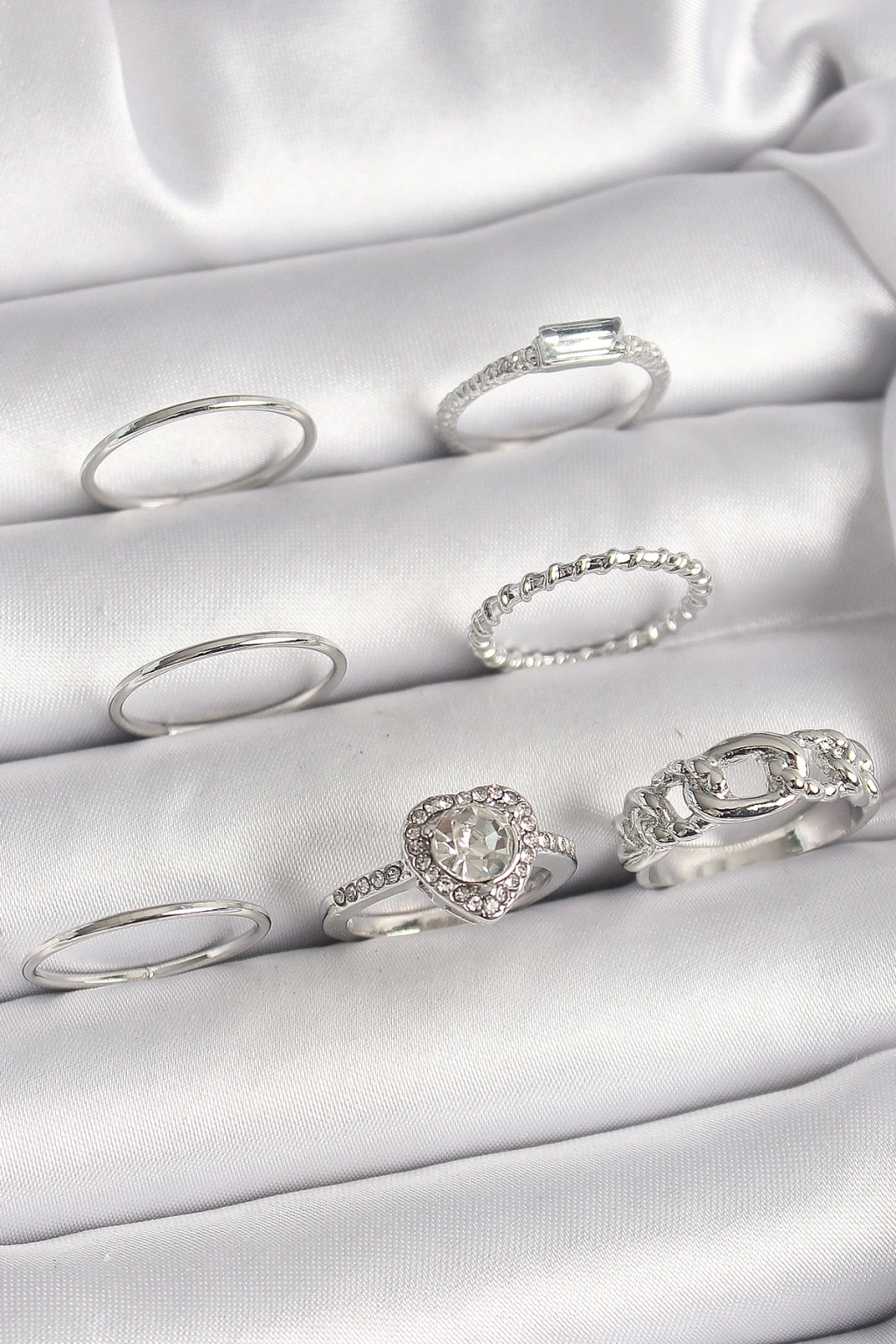 Erb Pirinç Gümüş Renk Zirkon Taşlı Kalp Model Kadın Yüzük Kombini