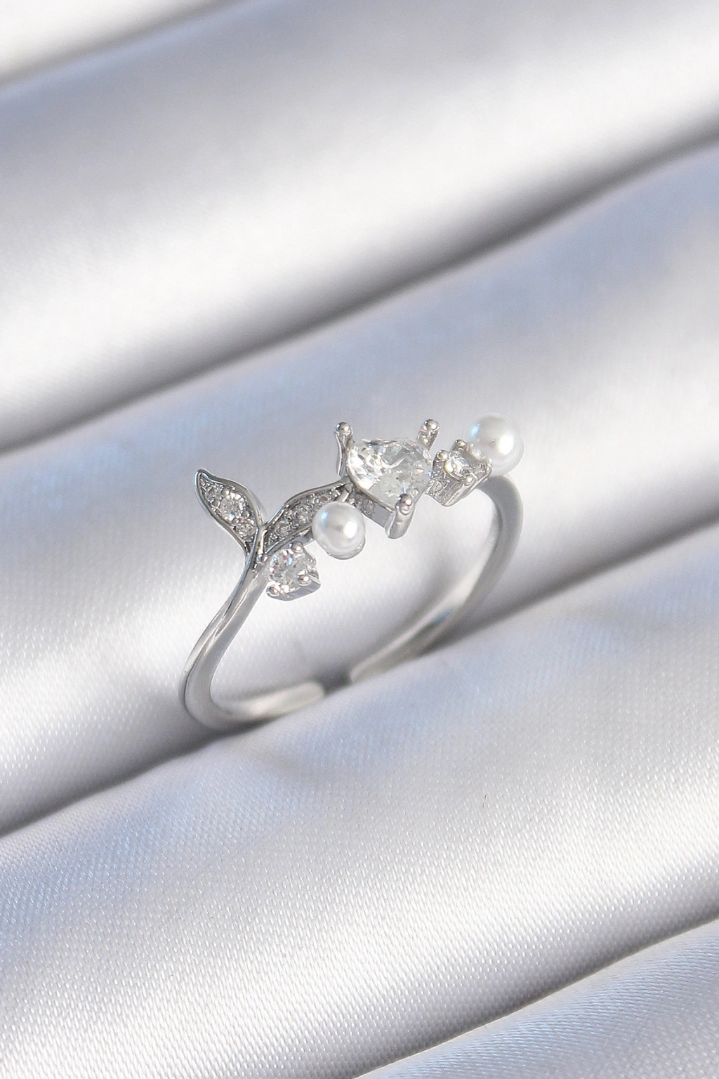 Erb Pirinç Gümüş Renk Zirkon Taşlı Kalp Yaprak Model İnci Detay Kadın Yüzük