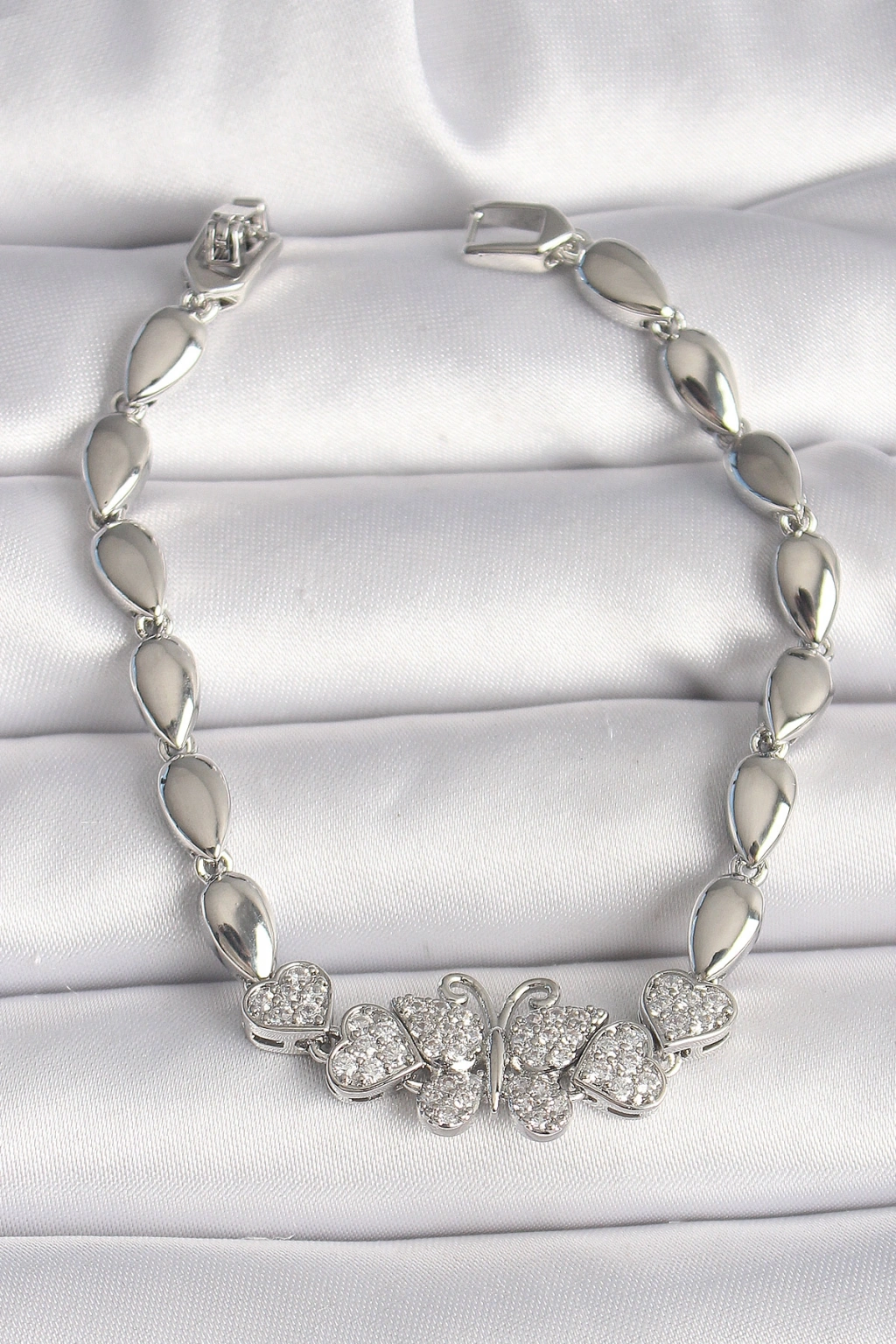 Erb Pirinç Gümüş Renk Zirkon Taşlı Kelebek Figür Damla Zincir Model Kadın Bileklik