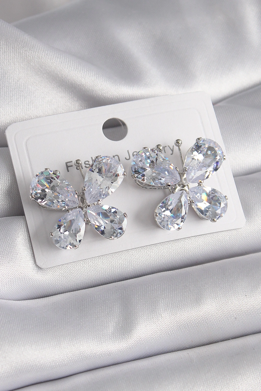 Erb Pirinç Gümüş Renk Zirkon Taşlı Kelebek Model Kadın Küpe