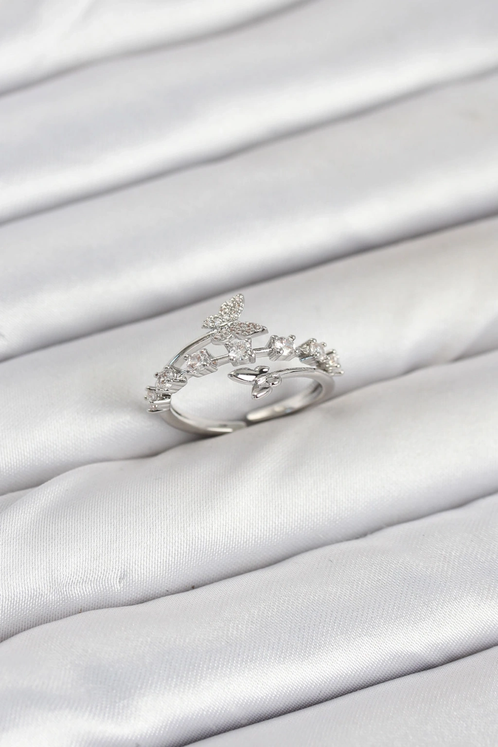 Erb Pirinç Gümüş Renk Zirkon Taşlı Kelebek Model Kadın Yüzük