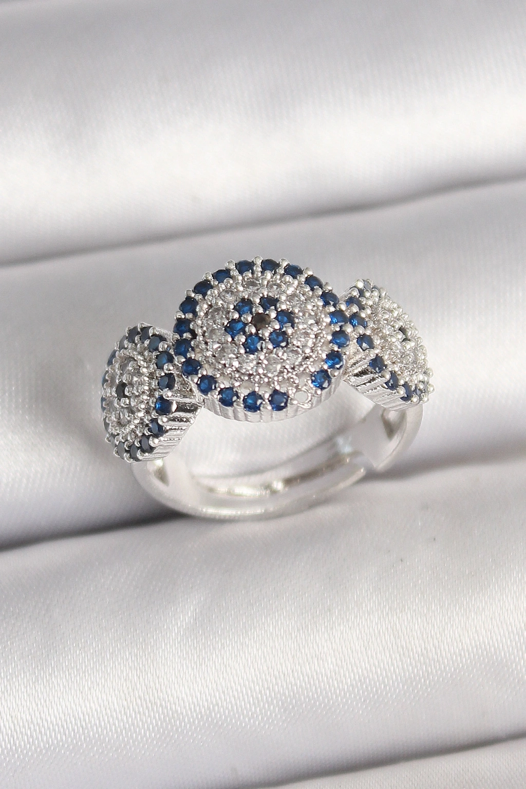 Erb Pirinç Gümüş Renk Zirkon Taşlı Nazar Boncuk Model Ayarlanabilir Kadın Yüzük