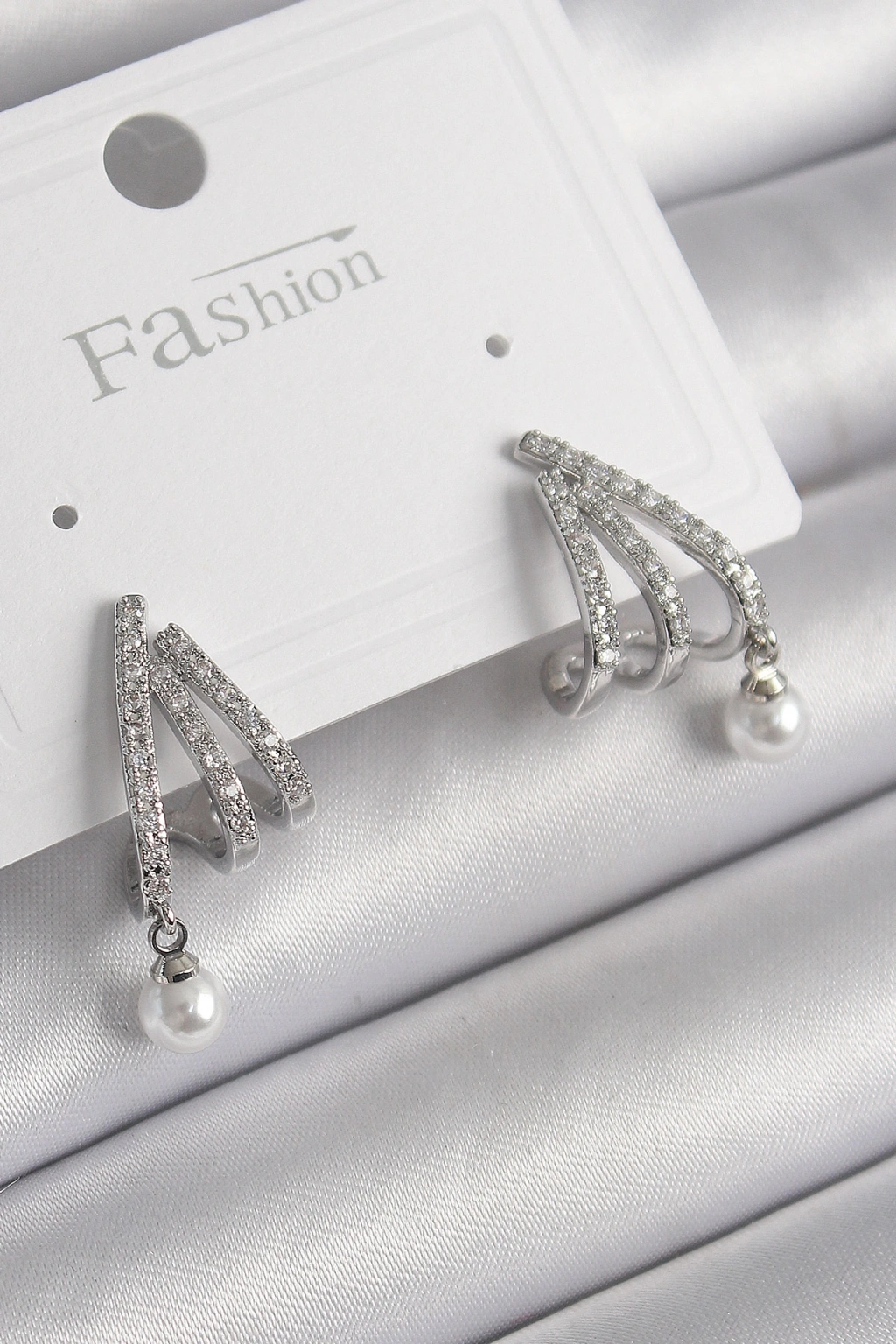 Erb Pirinç Gümüş Renk Zirkon Taşlı Pençe Model İnci Detay Kadın Küpe