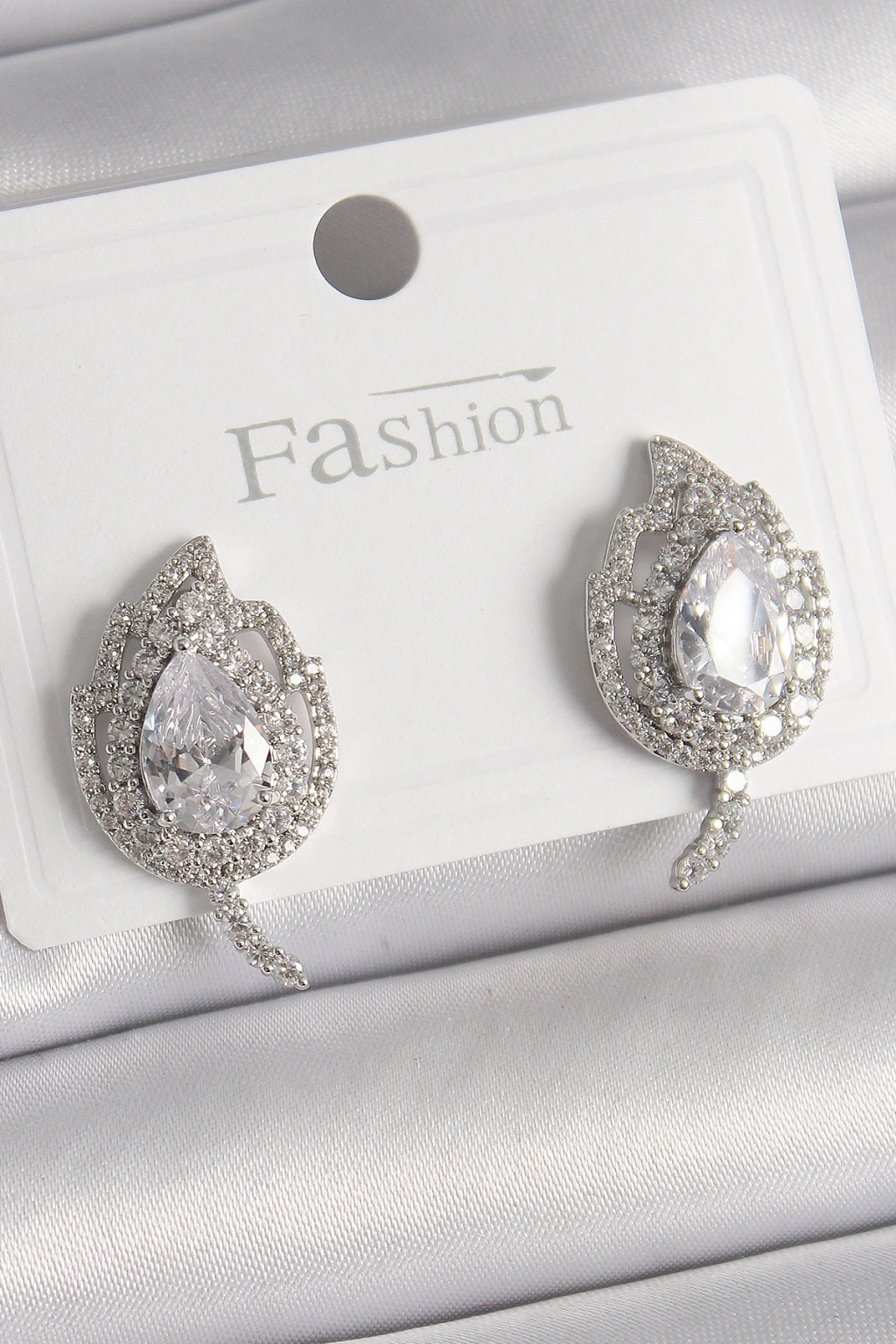 Erb Pirinç Gümüş Renk Zirkon Taşlı Yaprak Model Kadın Küpe