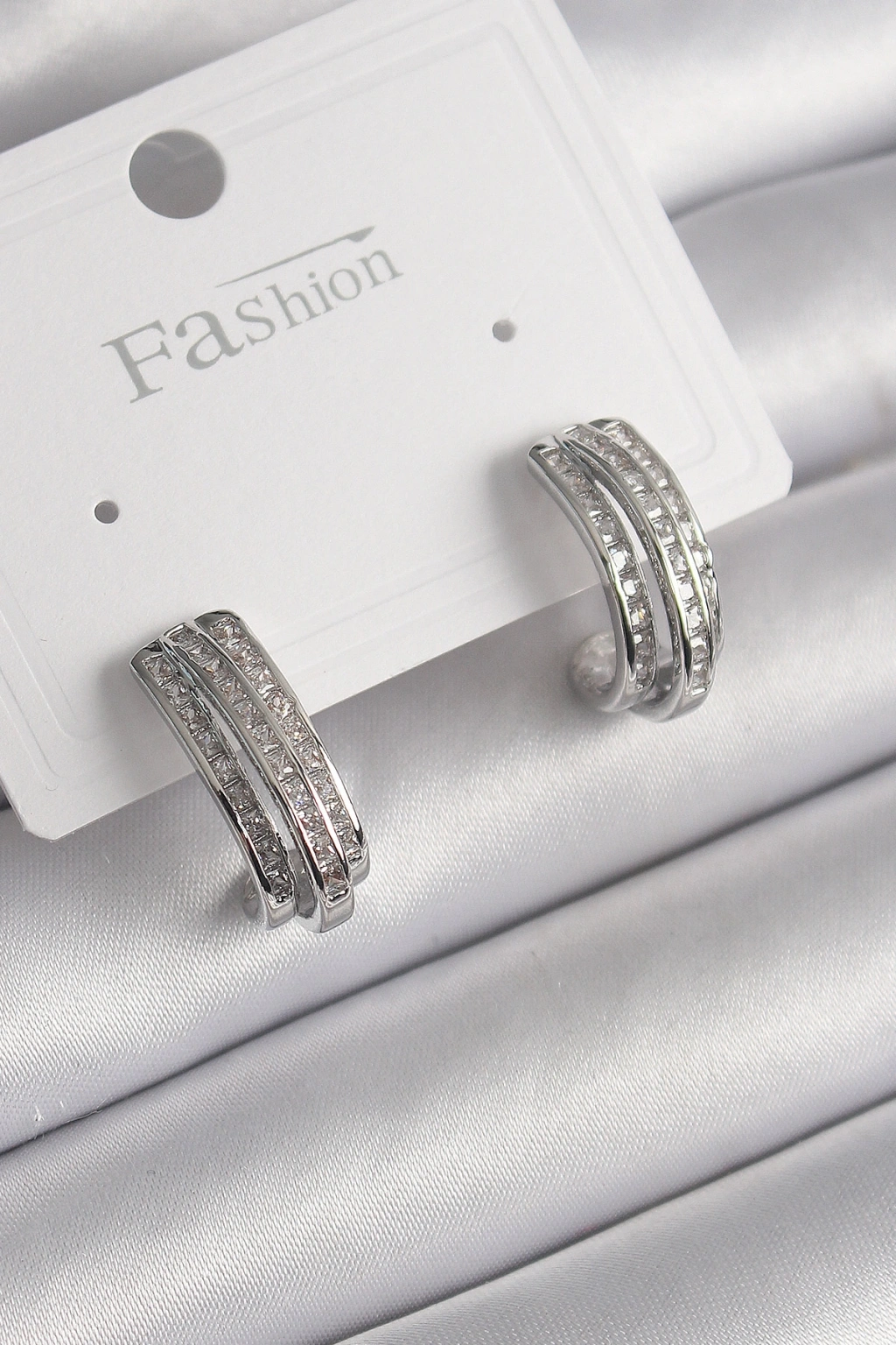 Erb Pirinç Gümüş Renk Zirkon Taşlı Yarım Halka Model Kadın Küpe