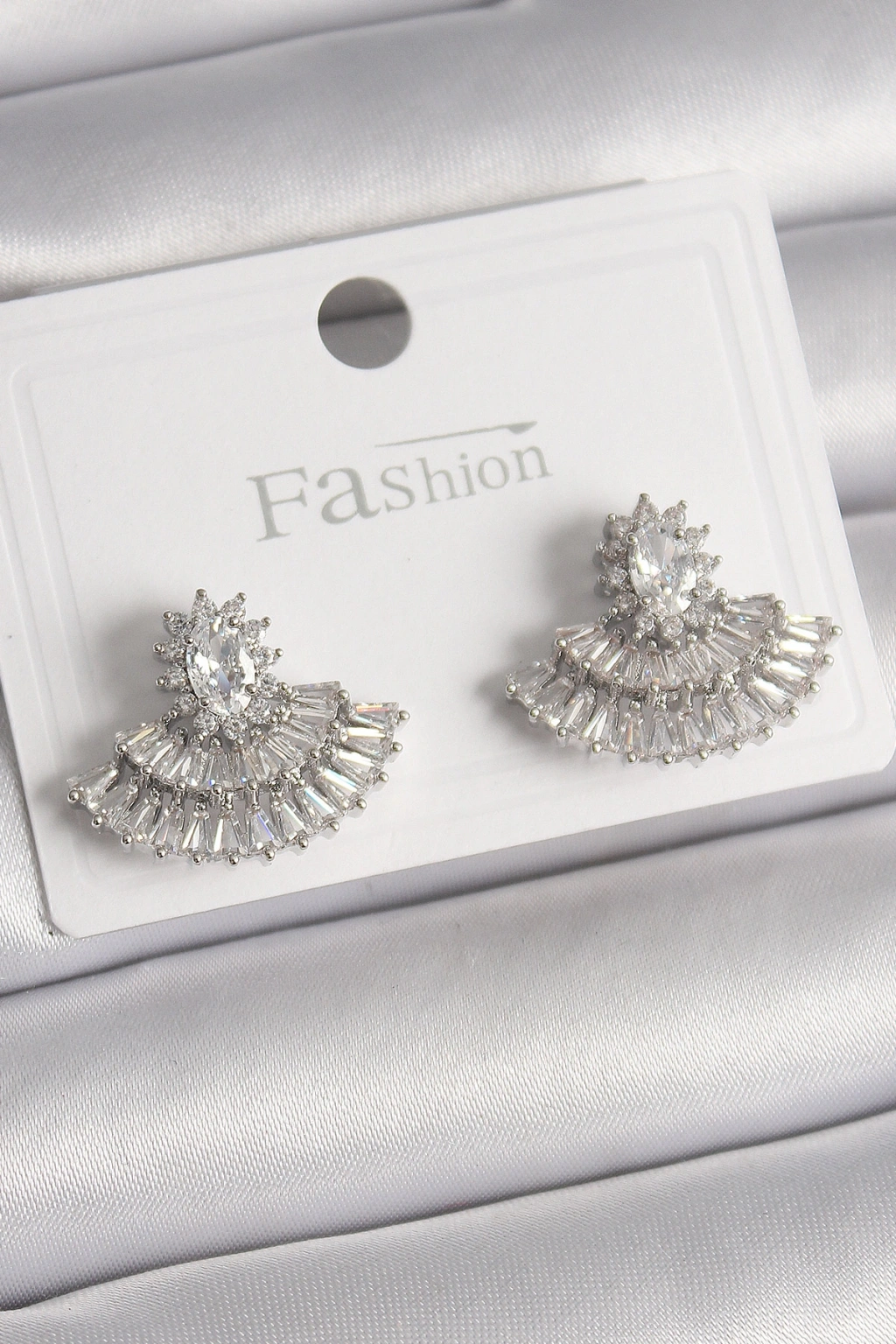 Erb Pirinç Gümüş Renk Zirkon Taşlı Yelpaze Model Kadın Küpe