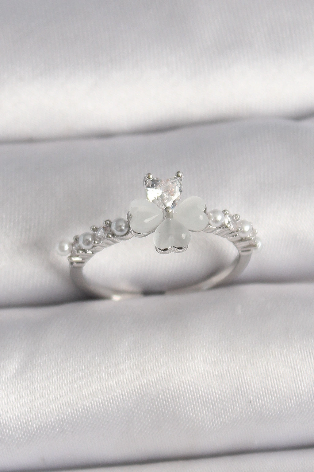 Erb Pirinç Gümüş Renk Zirkon Taşlı Yonca Model İnci Detay Ayarlanabilir Yüzük