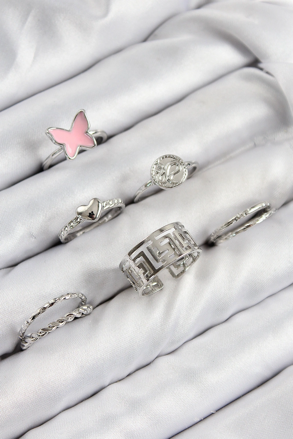 Erb Pirinç Kelebek Ve Kalp Model Gümüş Renk Kadın Yüzük Kombin Set