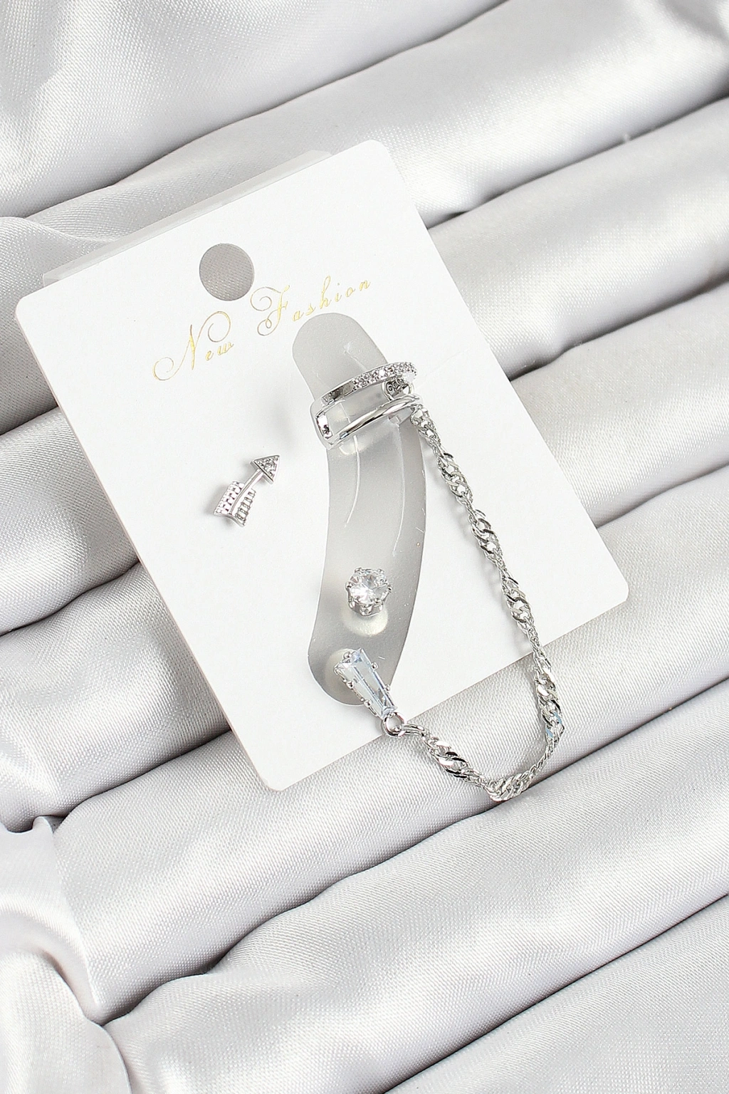 Erb Pirinç Ok Figürlü Zirkon Taşlı Gümüş Renk 3'lü Kıkırdak Kadın Küpe Set