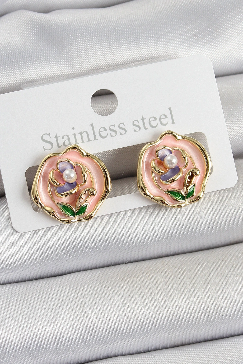 Erb Pirinç Pembe Mineli Çiçek Figürlü Sanatsal Portre Model Gold Renk Kadın Küpe