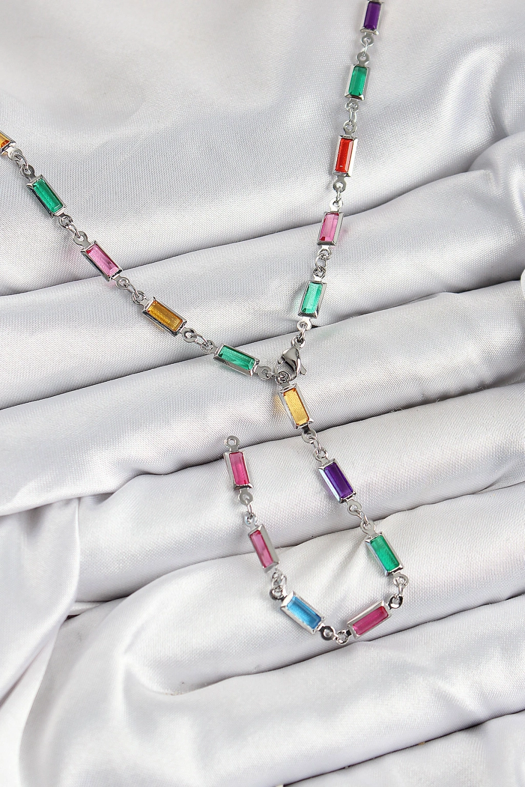 Erb Pirinç Renkli Zirkon Taşlı Dikdörtgen Model Gümüş Renk Kadın Y Kolye