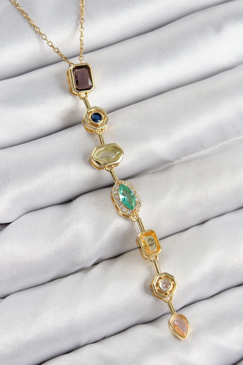 Erb Pirinç Renkli Zirkon Taşlı Model Gold Renk 7 Element Kadın Y Kolye