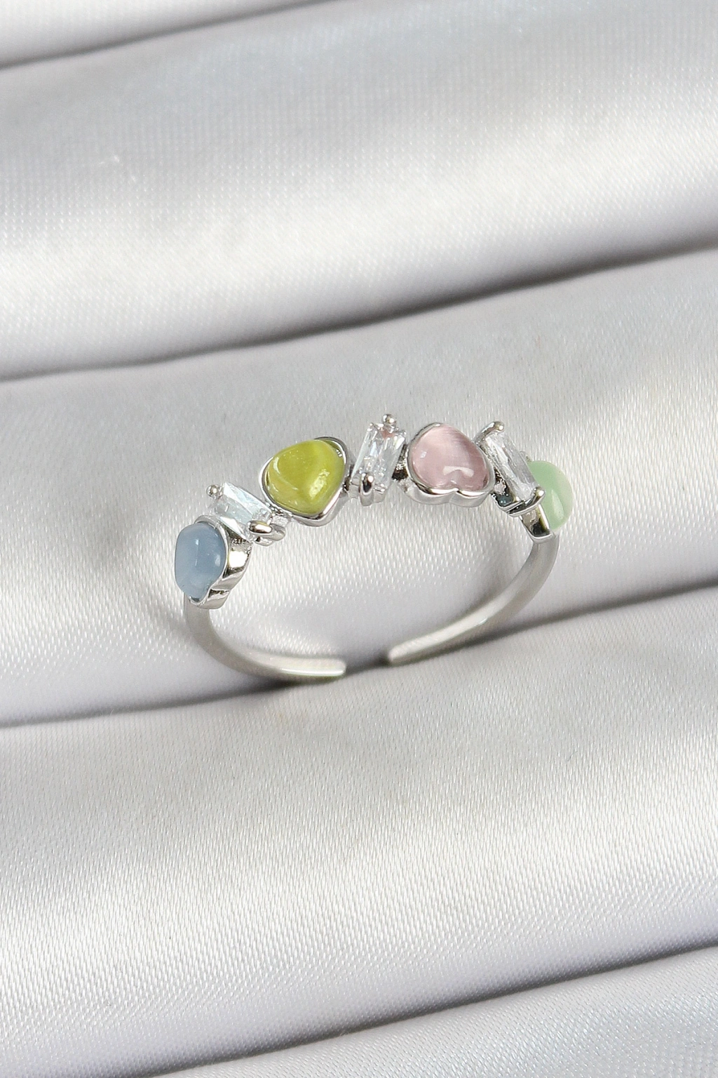 Erb Pirinç Sıralı Kalp Figürlü Zirkon Taşlı Gümüş Renk Ayarlanabilir Kadın Yüzük